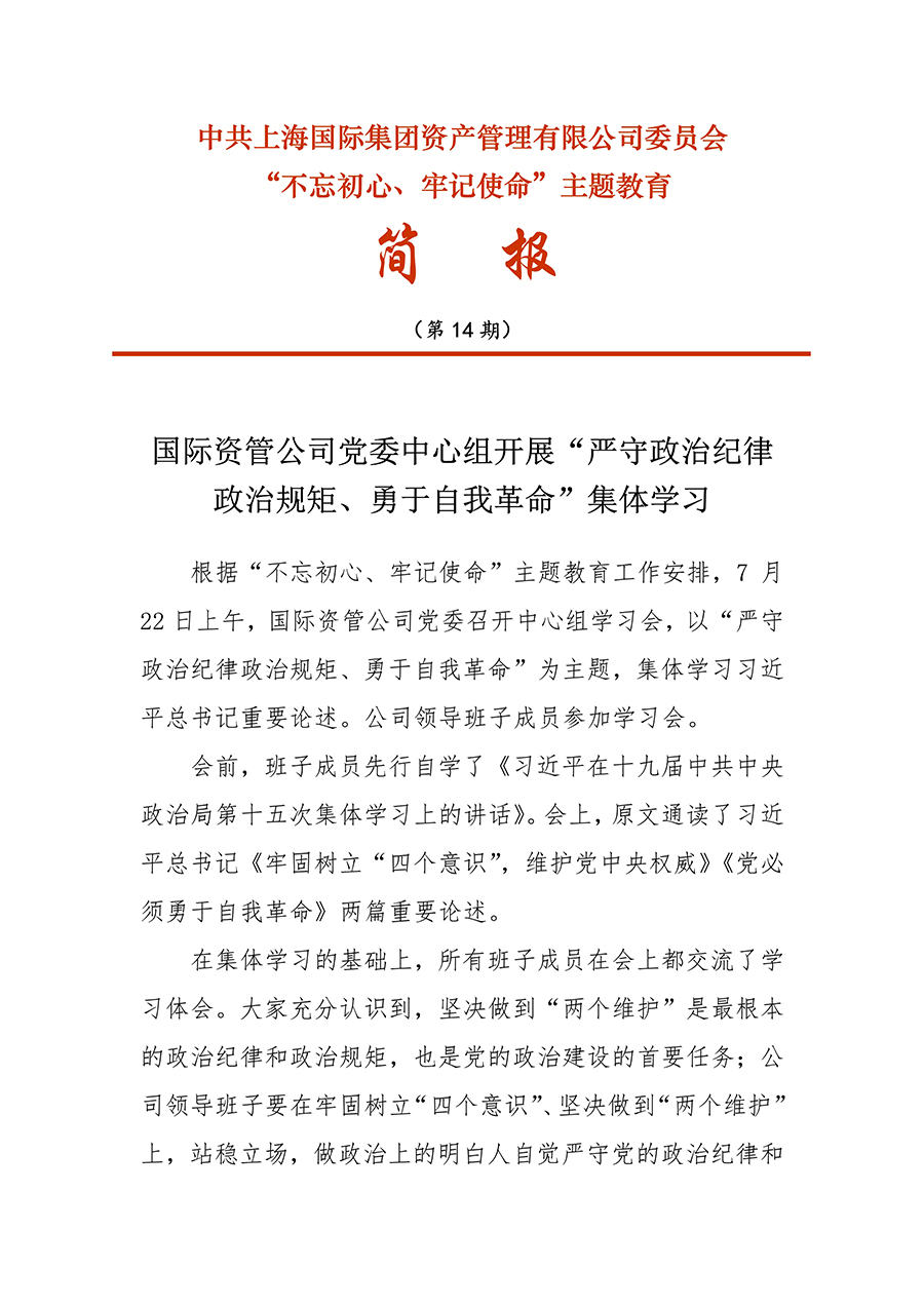 [不忘初心、牢記使命]14 國際資管公司黨委中心組開(kāi)展“嚴守政治紀律政治規矩、勇于自我革命”集體(tǐ)學習