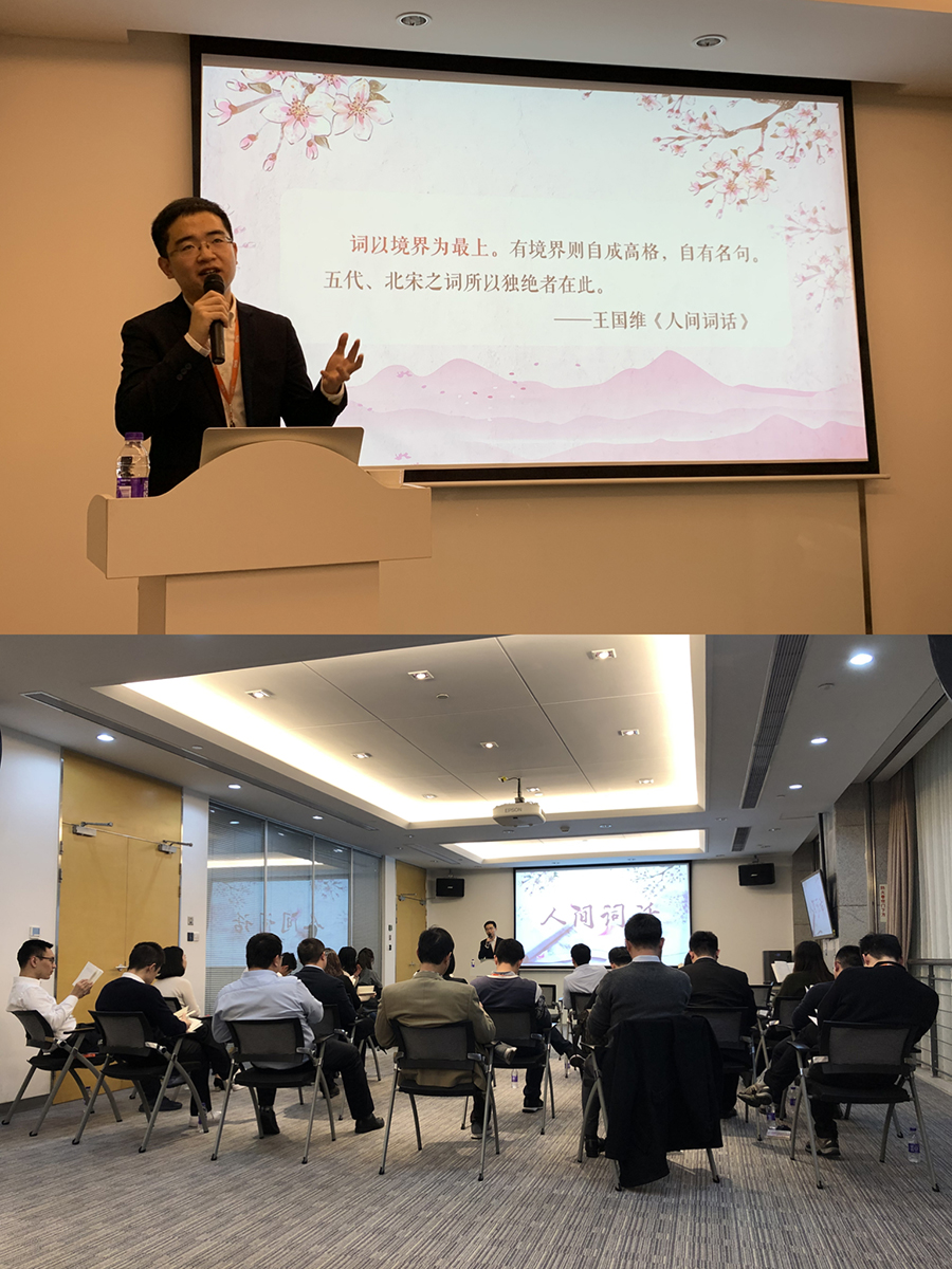 12月26日下午,國際資管公司于318多(duō)功能室成功舉辦“悅讀荟”四季讀書(shū)會(huì)2019年第四季活動。公司黨委辦公室的武晨昱與大(dà)家(jiā)分享了《人(rén)間(jiān)詞話(huà)》,他從作(zuò)者王國維的生(shēng)平經曆入手,結合詞的發展曆史和(hé)主要特點,圍繞王氏“境界”觀的基本內(nèi)涵,帶大(dà)家(jiā)共同走進《人(rén)間(jiān)詞話(huà)》的美學世界。活動受到了在場(chǎng)同事的一緻好評,也為(wèi)2019年的“悅讀荟”讀書(shū)活動畫(huà)上(shàng)圓滿的句号。